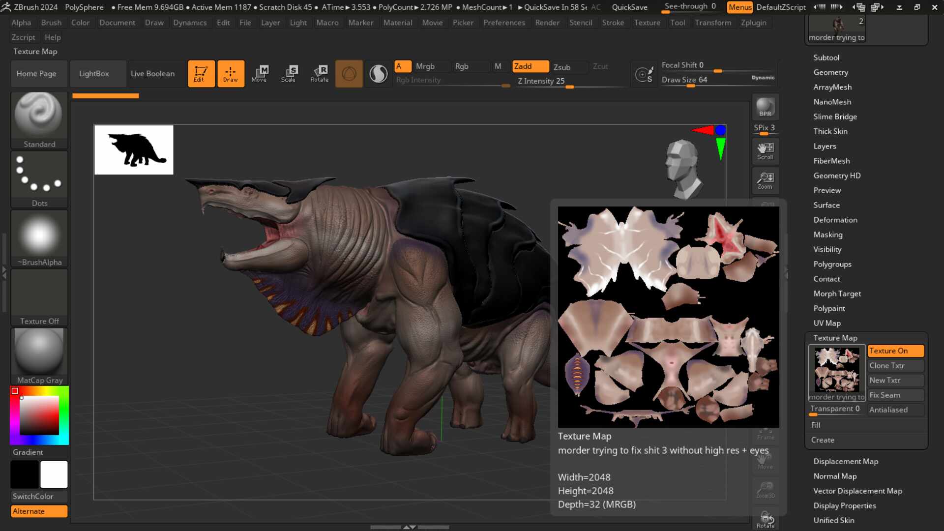 Hi chaps, anyone have any idea why my polypaint job on my creature isnt matching the colours when i assign a texture map to them? when i morph my uvs it shows the colours correctly but the texture does not. Any help is appreciated!!