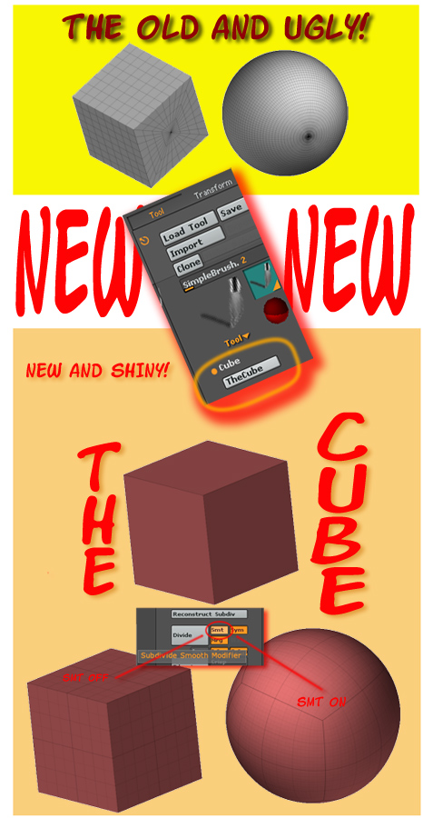 A: The cube can be subdivided, if the smooth button is off, a subdivided cube is the result (for Zeebling, and the popular box modeling, etc…), if the smooth button is ON, a really cool sphere is created as the edges are all pulled together. THAT sphere has NO pole, and accepts a UV map much easier than the sphere beast the Pixologists throw at us! Of course it has draw backs… I just can’t come up with one right now ;).