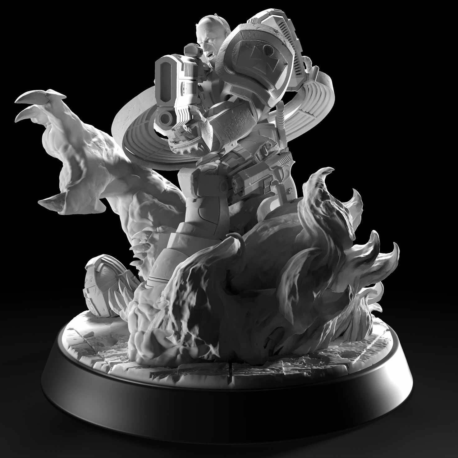 The veteran templar smokes a cigar while crushing the skull of a demonic abomination in another dimension.