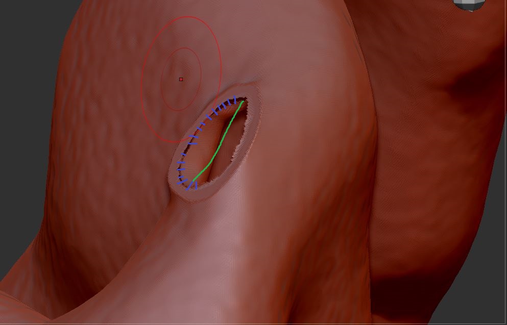 I’m trying to close a small circular deficit in my mesh (across the blue lines), but whenever I run dynamesh, it is closing the entire hole (the green line).