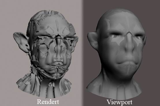 Here are some images of a max 8/mental ray-rendered displacement created with a 32-bit floating point displacement map saved as and RGB .exr image. No Blur Offset was used in max 8. I intentionally rendered an area of the mesh that has a large seam to show that the seam is non-existent in the render! This isn’t masterpiece work, but just a test to see if I could finally get things working…