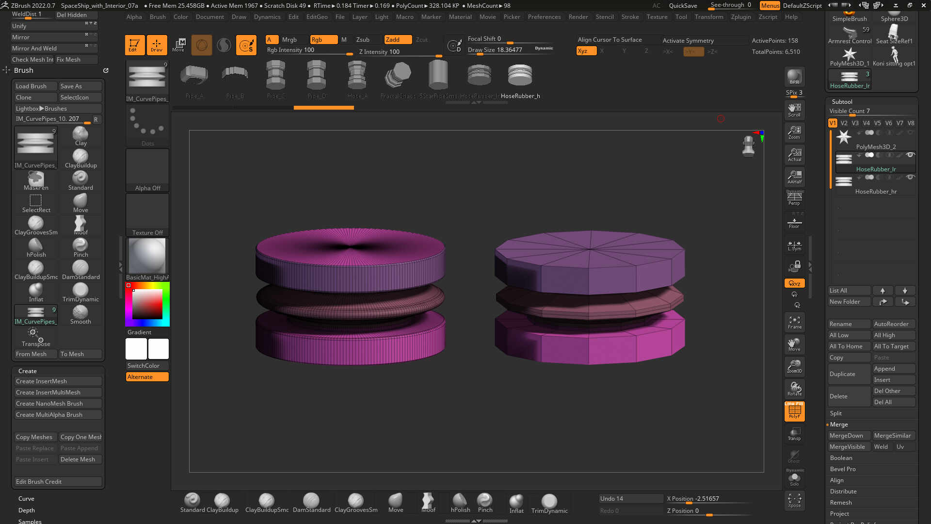 I made an IMM curve brush for a rubber hose. One as low res version, and a copy as high res version by subdividing it. The high res brush however does not act as expected, the resulting pipe is way bigger and, more problematic, way too dense ( Maybe too many brush samples ? ).