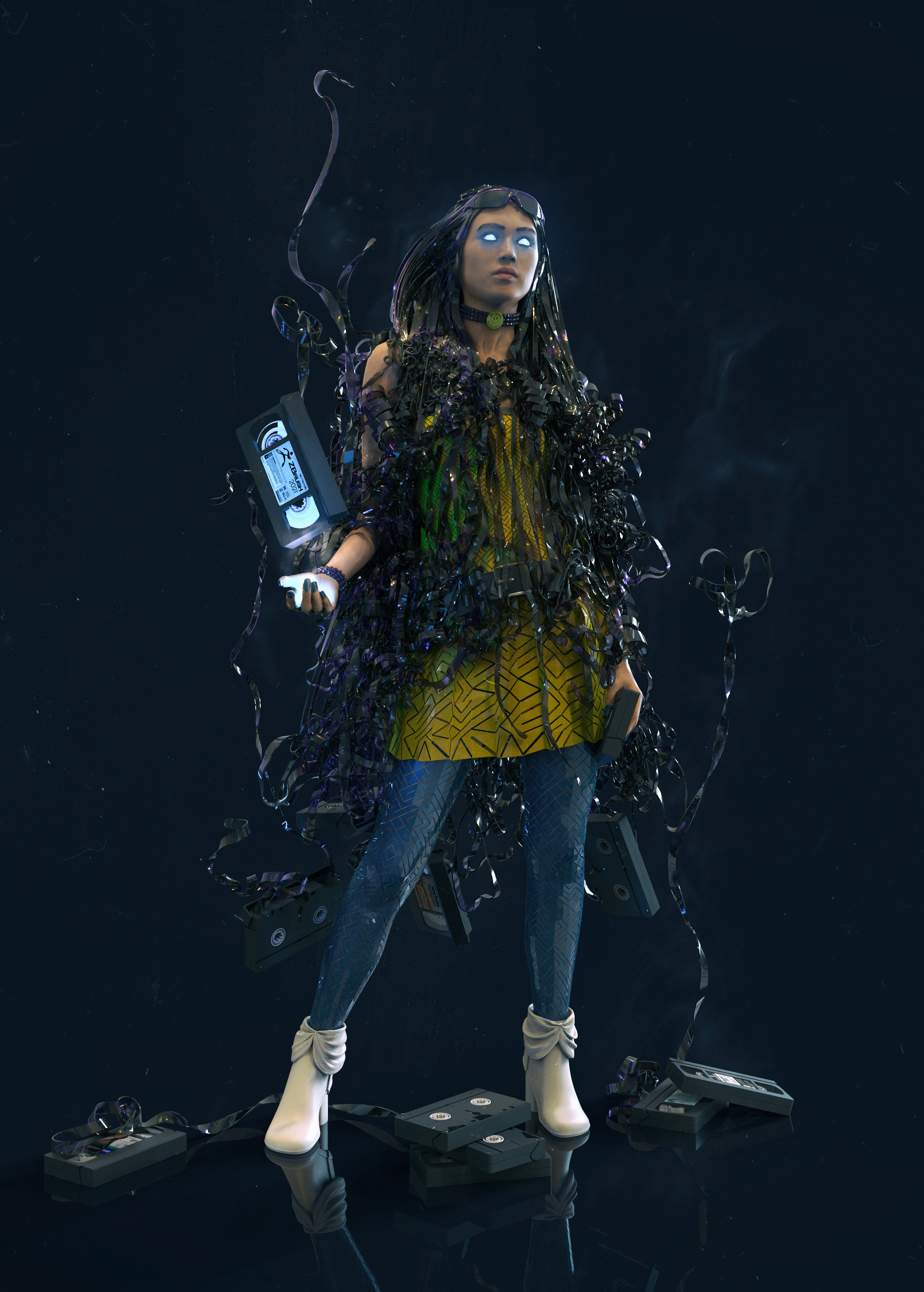 For this model I started experimenting with some curly hair (which worked really well!) From there I ended up seeing ‘VHS tape’ in the design. I then used the ZModeler brush along with live booleans to make the VHS cassette cases. Then used the dynamics to manipulate the tape to make it look ‘magical.’