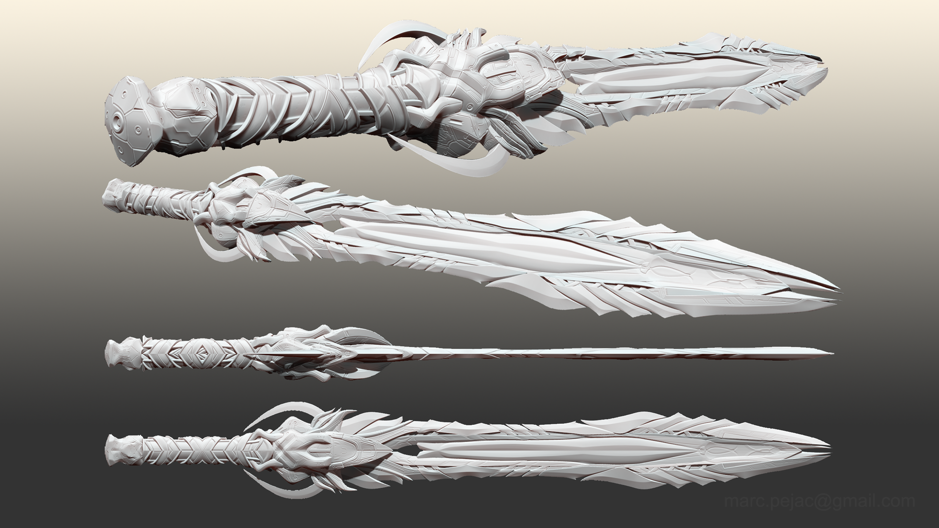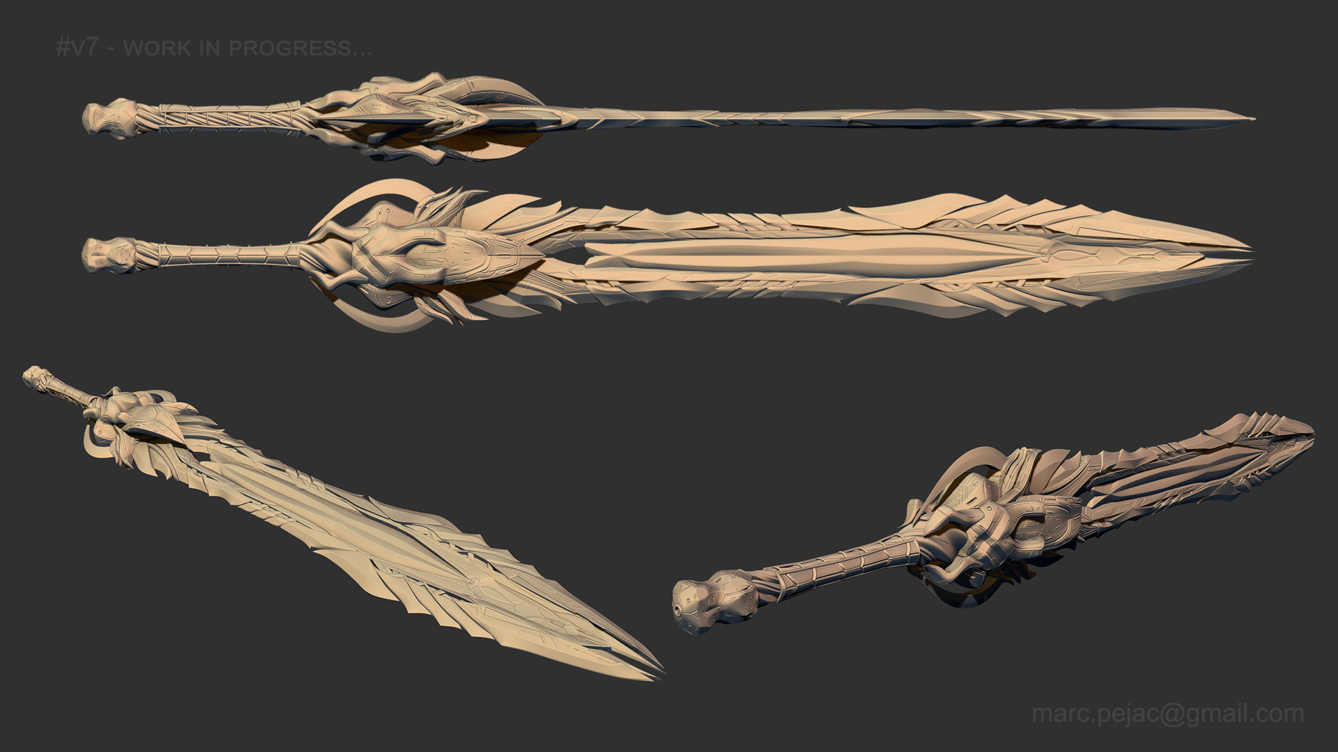 Hi, I’m currently working on a blade in order to integrate it in the game as a skin (hopefully it will be included). I layered most of the ideas and refined the details/shapes. Most of the details will come inside Substance Painter now. Any advice / suggestions before I get to the texturing ? Thanks.