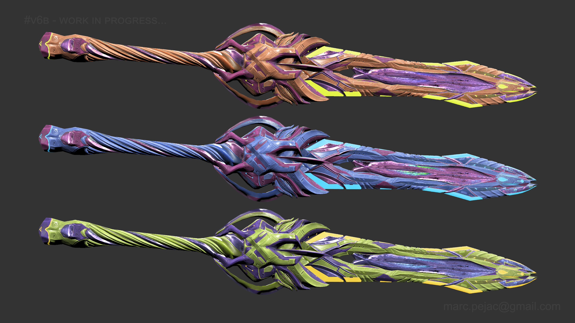 Hey I can’t believe I didn’t keep this post up. So I had a hard time making this blade work properly, the previous results were too grungy and lacked a proper reading. I’m trying at the moment some colors composition on this blade. It’s near the result I’m looking for