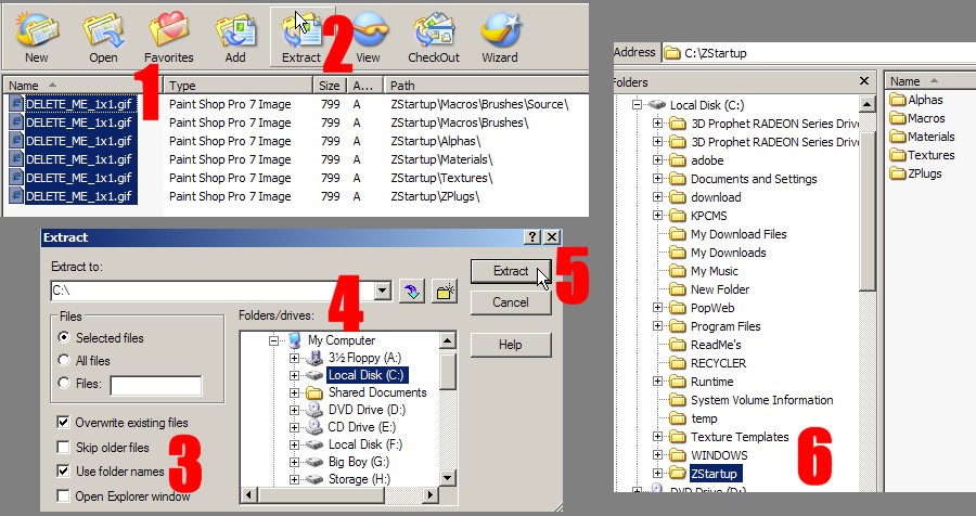 The instructions you want to give to your end user are : “Select the files you want > Extract > ensure ‘Use Folder Names’ is ticked > Navigate to C\Program Files\Pixologic and click on ZBrush3 to hi-light it > extract.”