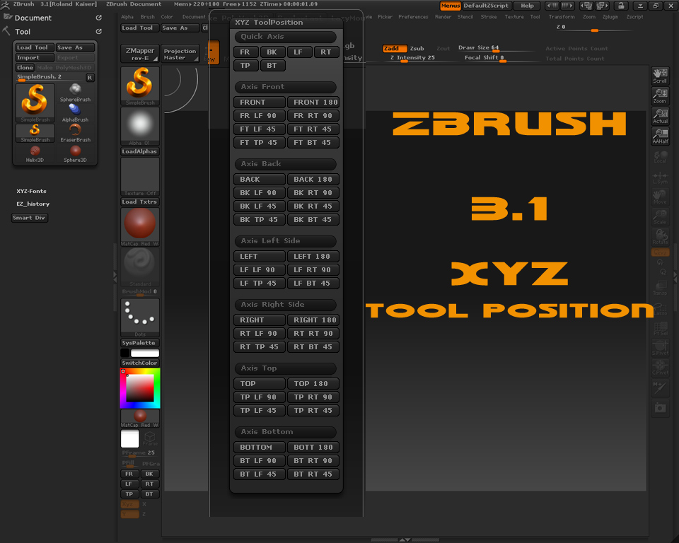 it does work for me too on zbrush 3.2 mac, but everytime i click either one of the axis buttons the entire zscript palette pops up under the cursor. anyone else using zb3.2mac having this issue? aside from that it still does what its supposed to do, many thanks roland kaiser.