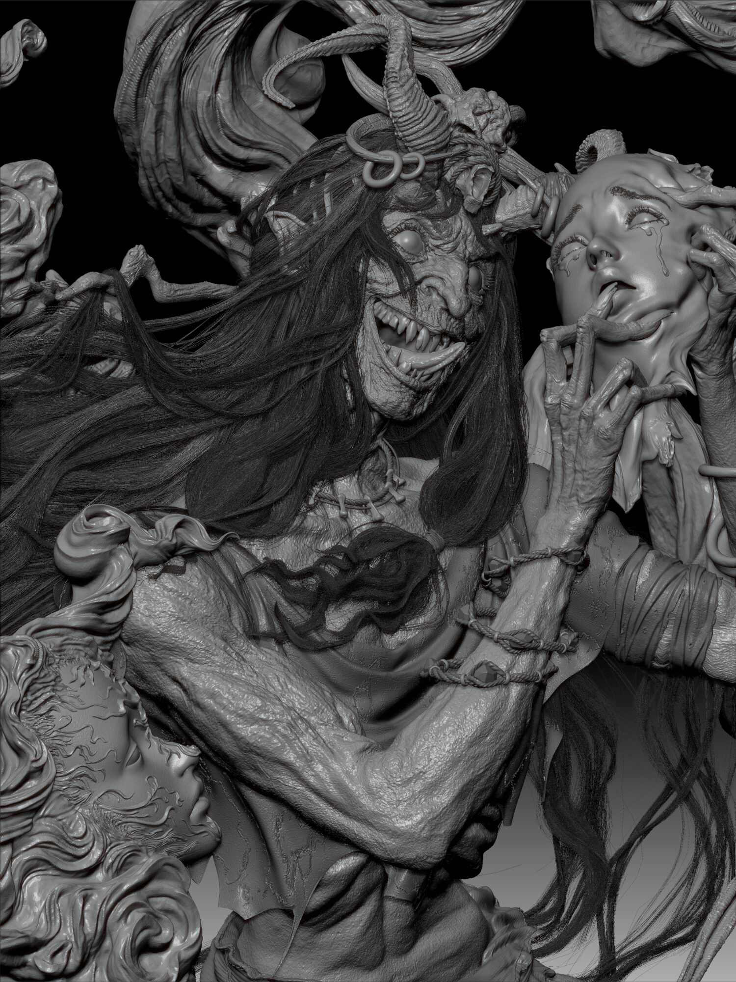 The girl in her hands is the latest offering — perhaps a sacrifice, perhaps a lost soul.