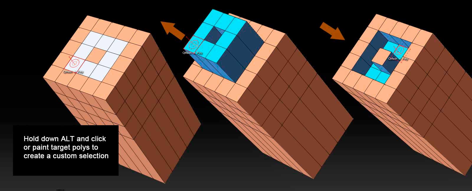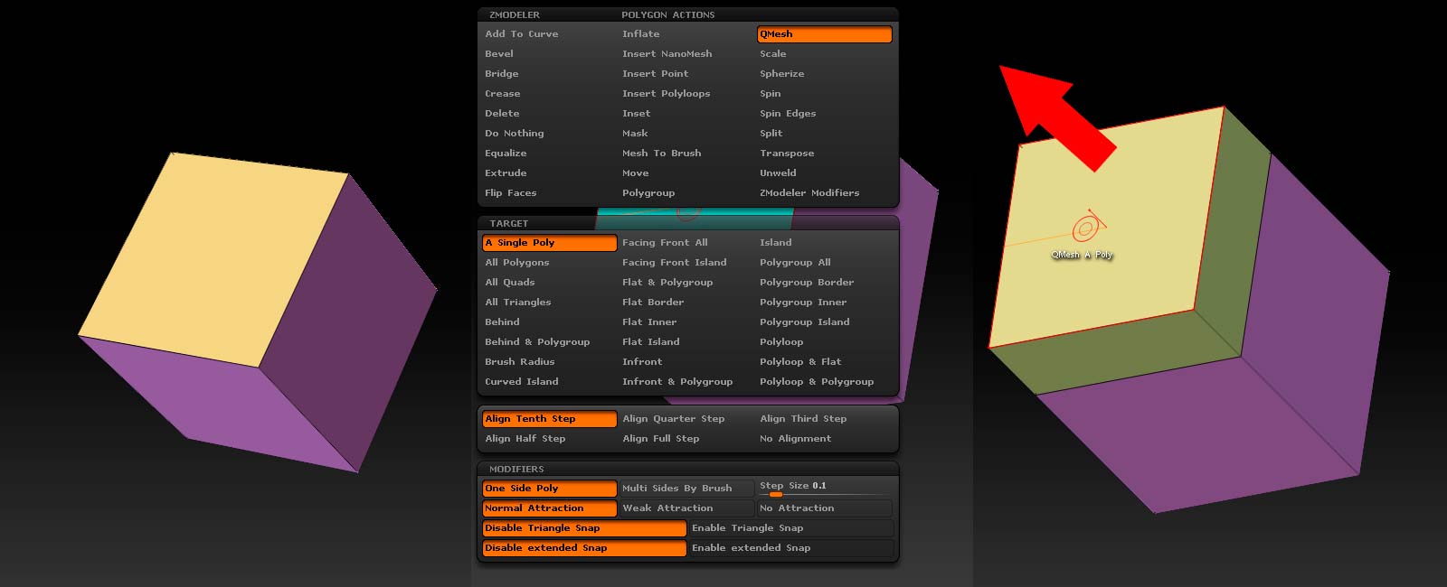QMesh extrudes polys outward or inward depending on the context of your cursor movement relative to the model. In most cases itâs pretty intuitive. I click on one side of the cube, and drag it outward, which creates new geometry from the starting point: