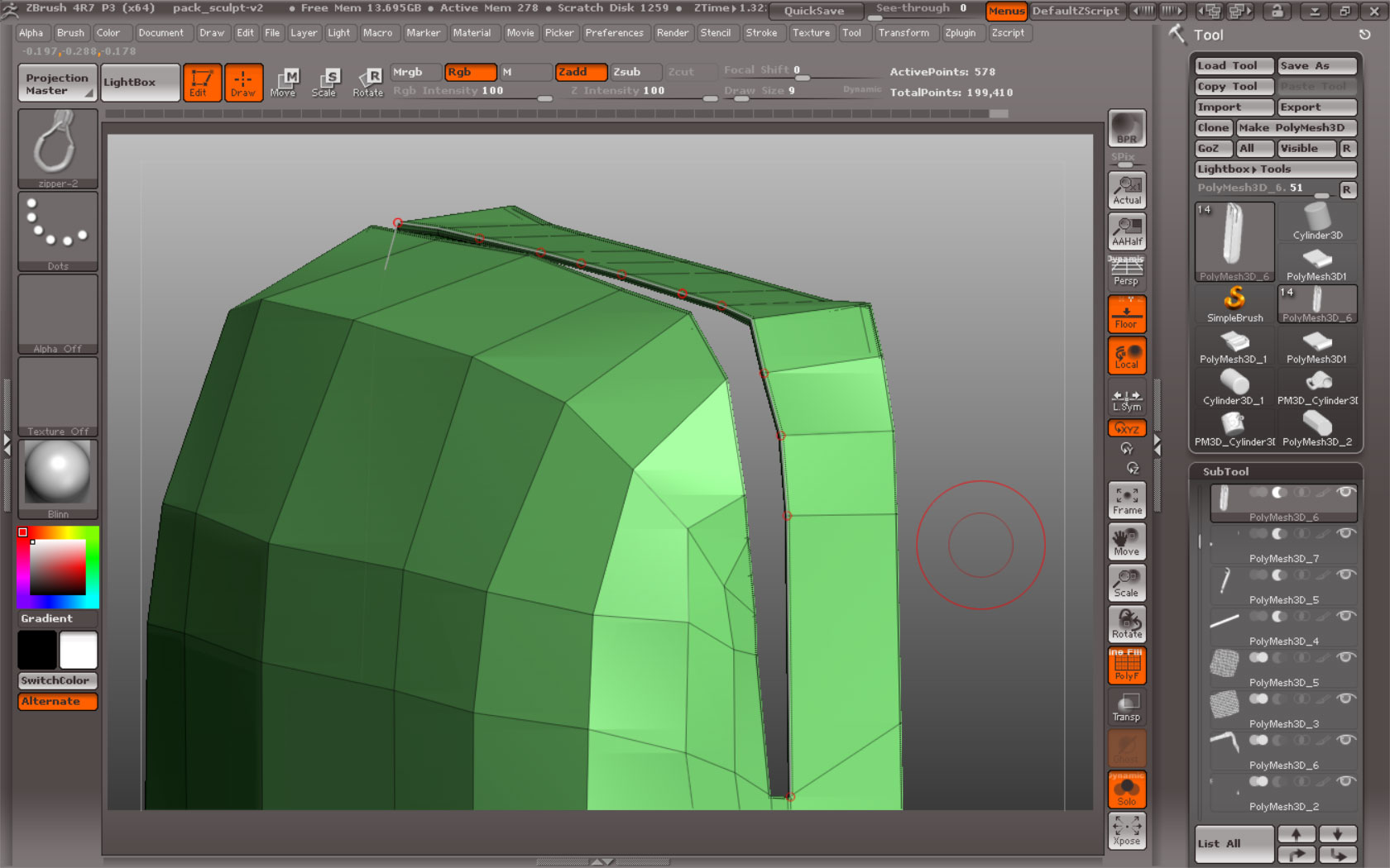 Has anyone else encountered this problem: when I use the zmodeler function, “add polygroup to curve,” I can then use an insert curve brush (in my case, an insert zipper brush) and the curve function seems to work properly, and I get a continuous zipper around the polygroup. However, when I use the zmodeler function “add edge to curve,” and I select a number of concentric edges (see screenshots), and then use my insert mesh, I get a bunch of zipper segments of my tri-parts brush… which, obviously, is not what I want. Does anyone know a workaround for this, or what I’m doing wrong? Any help would be much appreciated!