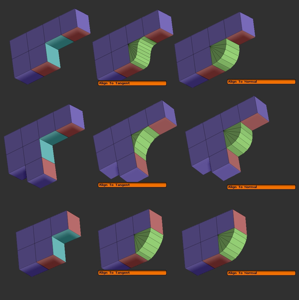 Here’s a comparison of the effects and as you can see the S curve is created when you choose the Align to Tangent option and the neighboring polys (red) are parallel to each other.