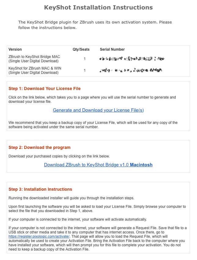 I’m still having some trouble, I hope someone can help. I purchased the bundle and finally received the links. One was for a license file, the other for the bridge. I never received anything that indicated a link to the actual keyshot for zbrush program. So I followed the instructions and downloaded from the links. When I tried to open the keyshot installer, it tells me that keyshot is not present. I assume that what is happening is that the bridge is trying to install, but there is no actual keyshot yet. I may be missing something. Can anyone point me in the right direction?
