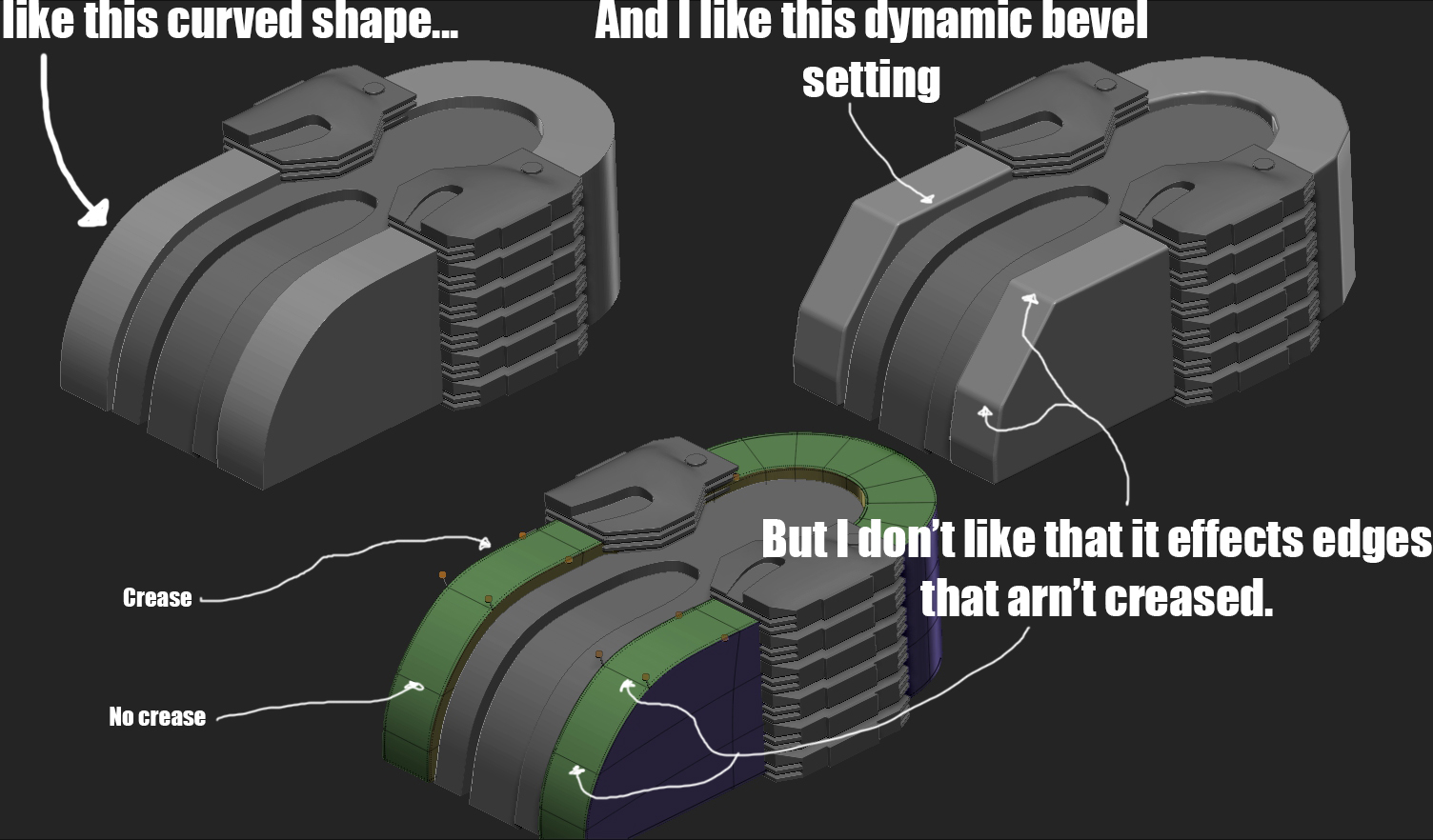 I’m loving the dynamic subdivision for the hard surface stuff. The dynamic bevel & chamfer are great but one thing that I’d love to see added is the ability to have the bevel/chamfer settings only effect creased edges or possibly some other way to select which edges get effected. The image below shows what I mean.