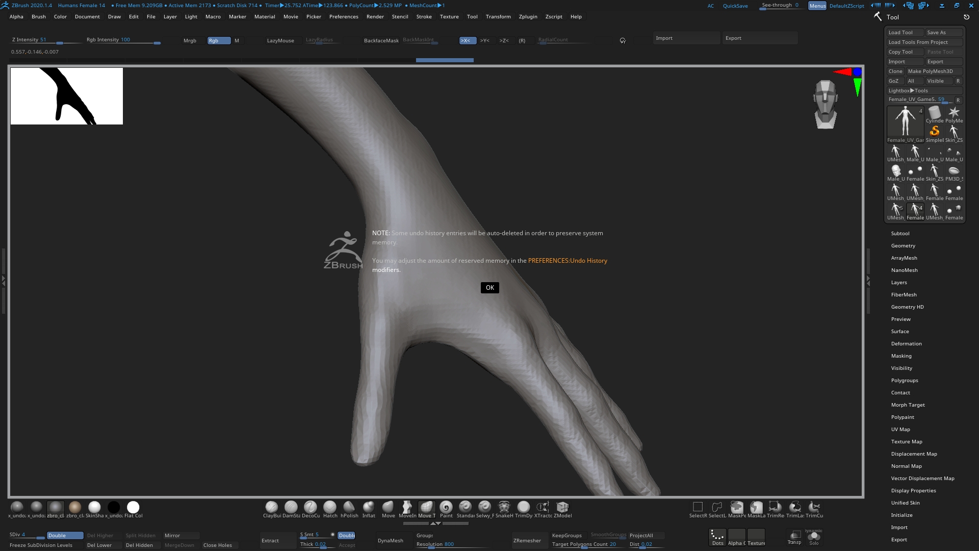 If you receive this message, it means that you have reached the threshold set in Preferences> Undo History menu, and it’s notifying you that some entries will be deleted to free up space. Remember that a project file saves ALL tools and subtools loaded into it, and each subtool has its own undo history. This can add up quickly. If you don"t require all those extra tools loaded into the scene, consider only working on your active tool as a ZTL (tool) file. This format only saves the active tool.