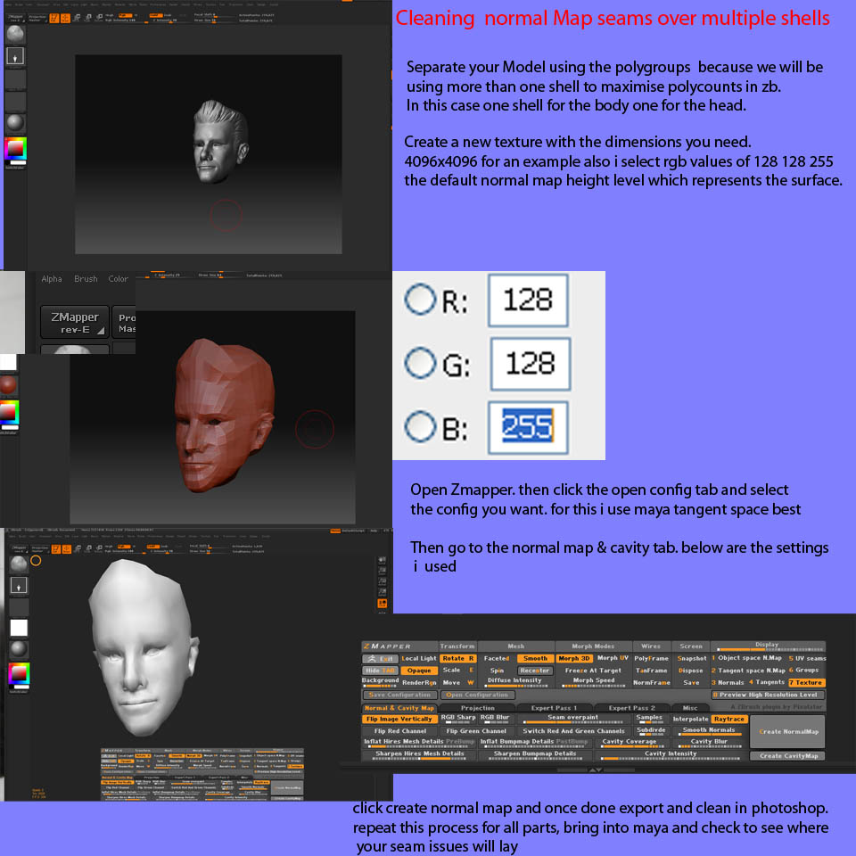 with 4 uv sets apiece and break points along the model to boot. Hence this tutorial. This method is using just ZB and CS3 (maya for viewing). Since we will be using