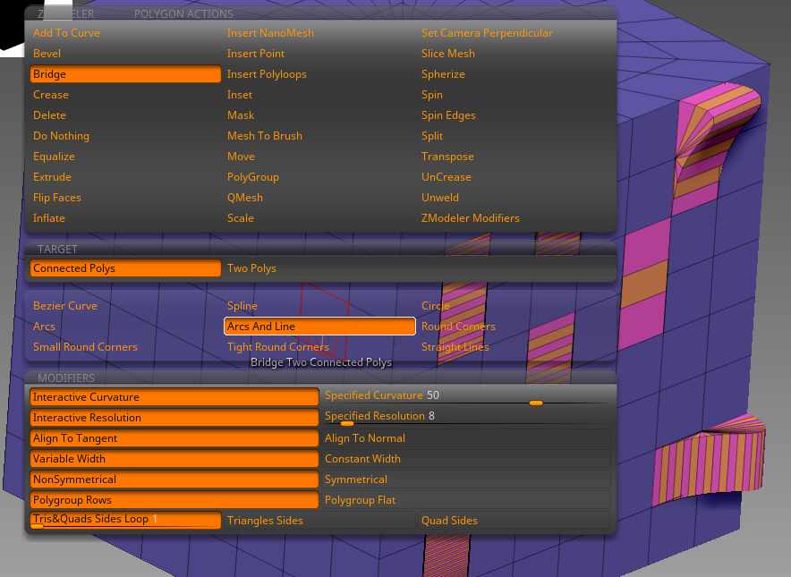 [Edited to add screenshot showing what happens when I try to bridge to poly’s at 90 degrees to each other. NO option will produce a nice curved arch.]