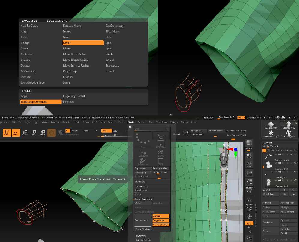 With the Mask by Feature option, one of the options allows you to convert any Creasing into masking, and there are many options for defining Creases. One of my favorite features for quickly defining the path for a Crease on complicated topology is the ZModeler> Point> Crease> Shortest Path feature. With this you can rapidly click from point to point on a mesh and it will crease the shortest path in between those points. This lets you crease large sections of an edge loop quickly, then manually go point to point in more complicated areas to get exactly the crease you want. That Creasing can then be converted to Mask.