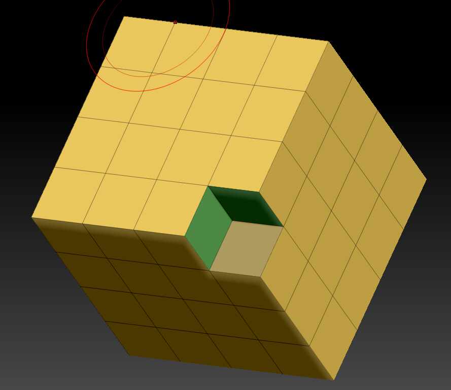 So in the following example, I have Qmeshed a single polygon on the edge of the cube where it has clear edges to snap to. This creates very even, expected results. If you simply click on any other polygons where the same conditions are true, it will collapse them to the same depth. In this case, I can select the entire ring of edge polygons and collapse them to the same depth with a single click. However, if I try to include those interior polygons at this point, QMesh won’t have edges to reference for all the polygons, and your results will be uneven.
