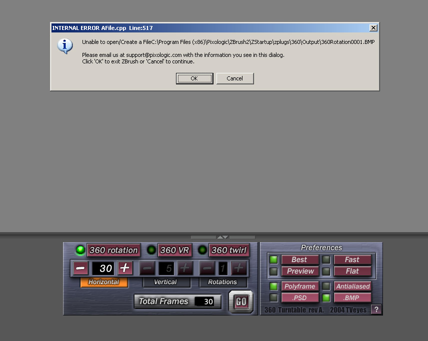 I am not sure if anybody has noticed but there are various errors that occur due to the object still being edit mode while rotated/rendered. All types of things can happen if you move the cursor while it is rendering. A frame can be skipped, a mouse click can be registered and draw color on your model, the list goes on. I am certain I can fix this for the next version. But note that this has only happened during the very long renders 30-40 minuttes where I have been surfing while Zbrush rendered. If you leave the computer alone after you press ‘GO’ you should be okay(unless you have a texture map applied to your model)
