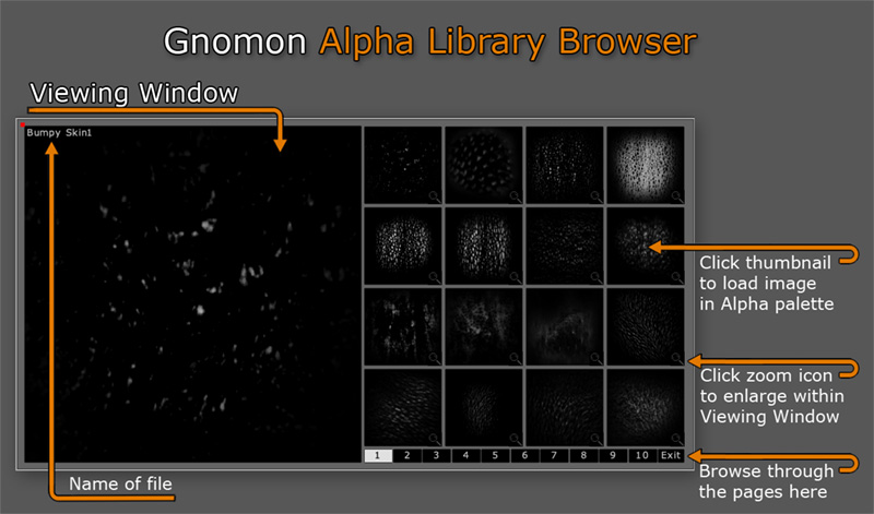 Welcome to ZBrush’s Gnomon Alpha Library Browser. This ZScript utility works exclusively with the alpha library set: ZBrush Alpha Library from Aaron Sims and the Gnomon Workshop.