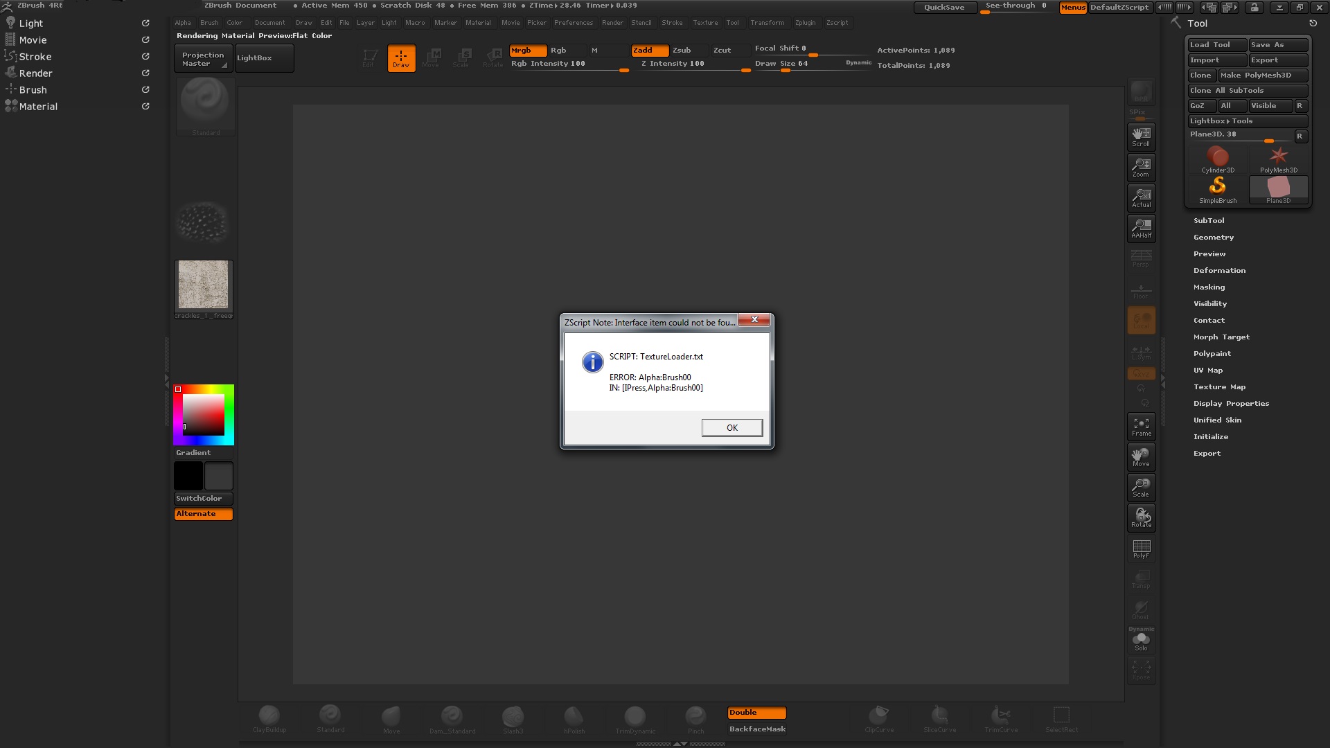 I’ ve the command in texture and alpha palette, when I load them the interface pops up, but when I clic on “add” to add alphas or textures,